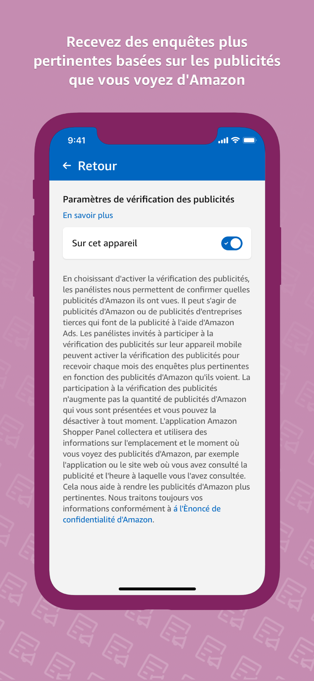 Il est facile de gagner des récompenses. Vous gagnerez des récompenses chaque mois pour chaque sondage que vous remplirez et si vous activez la vérification des annonces sur votre appareil mobile, vous recevrez plus de sondages pertinents chaque mois en fonction des annonces que vous verrez d'Amazon. En France, il n'est pas possible de gagner des récompenses en partageant les reçus d'achats effectués en dehors d'Amazon.fr. Le nombre de places est limité et il se peut que vous ne puissiez participer qu'à certaines parties du programme. Vous pouvez vérifier si vous êtes éligible en appuyant sur les onglets Reçus ou Sondages, ou en visitant la section Vérification des annonces dans les paramètres de l'application.